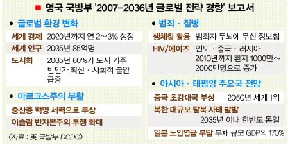 DCDC는 보고서에서 2035년 세계 인구가 85억명에 이르며 중동 지역은 같은 기간 132%, 아프리카 사하라 이남 지역의 인구는 13억명으로 81%나 급증한다고 추산했다.2010년이면 세계 인구의 50%가 도시에 거주하고 2035년까지 도시 인구가 60%로 확대될 것으로 내다봤다. 한반도는 30년 이내에 북한 붕괴로 통일 시대를 맞게 될 것이라고 전망했다.