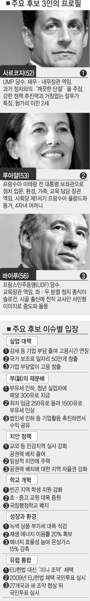 그러나 변수는 많다. 부동층은 여전히 30∼40%나 된다. 여론조사 결과 결선에서 사르코지나 루아얄 누구와 붙어도 이기는 것으로 나오는 중도파 바이루 후보의 ‘결선 경쟁력’도 무시못할 요인이다.