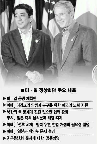 아베 총리는 27일 조지 W 부시 대통령과의 정상회담에서 미·일 동맹, 북핵 및 납치, 일본군 위안부, 헌법 개정 등 꺼낼 수 있는 대부분의 현안을 의제로 삼았다. 또 부시 대통령으로부터 ‘긍정적인 반응’을 끌어냈다. 때문에 ‘잰 걸음 외교’라는 비아냥에도 불구, 일단 성공적이라는 평가가 적잖다.