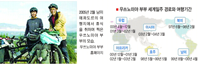 교사 출신인 우쓰노미야는 회사원이었던 부인과 함께 지난 1997년 6월 앞뒤로 앉는 2인승 자전거를 타고 북미를 첫 출발지로 삼았다. 북미를 누빈데 이어 뉴질랜드·호주·남미·유럽·중동·동남아시아를 거쳐 지난 5일 필리핀에서 타이완에 도착했다. 국가를 이동할 땐 자전거를 분해, 배나 항공기의 화물로 수송했다. 도모코는 “엄청나게 힘든 여행이었지만 기대했던 것보다 훨씬 재미있고 보람있었다. 많은 사람을 만났고 아름다운 곳도 많이 가봤다. 남편과 길 위에 있을 때 행복했고 모든 어려움은 그럴만한 가치가 있었다.”고 회고했다.