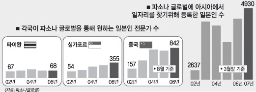지난 몇년간 얼마나 많은 일본의 기술인력들이 해외로 나갔는지 정확히 파악되지는 않고 있다. 그렇지만 해외취업 전문업체인 파소나 글로벌에 아시아 국가에서 일자리를 찾기 위해 등록한 사람 수는 올해 3월 현재 4930명으로 5년 전인 2002년의 2637명에 비해 거의 배로 늘었다.