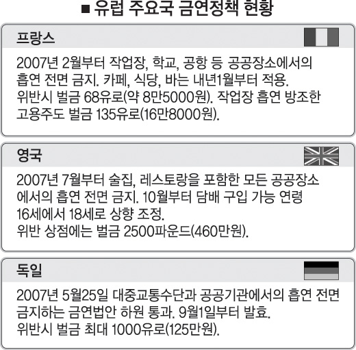 각국 정부가 공공건물 내에서의 금연정책을 도입한 이후 생겨난 지구촌 풍속도다. 하지만 유럽의 흡연 직장인들은 유일한 ‘끽연’ 장소였던 이곳마저 곧 빼앗길 위기에 처했다. 유럽연합(EU)이 실내는 물론 건물 출입구 주변을 비롯한 야외에서의 흡연을 제한하는 내용의 강력한 금연 정책을 추진하고 있기 때문이다. 영국 일간 가디언은 3일 EU가 대중 밀집 지역인 야외 경기장과 놀이공원, 버스 정류소, 기차역 등에서의 금연을 고려 중이라고 보도했다.EU보건당담 집행위는 병원이나 공공서비스 기관, 청소년 활용 시설의 경우 건물 출입구로부터 반경 9m를 금연구역으로 정하고 있는 캐나다 퀘벡시 사례를 도입할 것으로 알려졌다. 유럽 각국은 갈수록 ‘담배와의 전쟁’의 수위를 높이고 있다. 오는 7월부터 공공장소에서의 금연법을 시행하는 영국도 조만간 버스 정류소와 운동장, 건물 출입구 등에서의 흡연을 제한할 움직임을 보이고 있다.