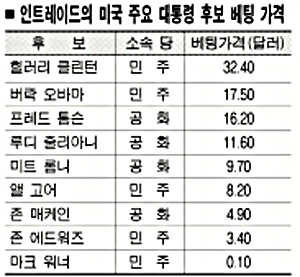 대선 당선자 베팅에서 가격 1위는 힐러리 상원의원. 그러나 베팅 가격은 32.40달러로 민주당 후보 당선 베팅 가격보다는 낮다. 민주당 후보가 될 확률보다 대통령 당선 가능성은 떨어진다는 의미다. 대선 후보 전체 베팅 가격 2위도 17.50달러를 기록한 민주당의 버락 오바마 상원의원이었다.