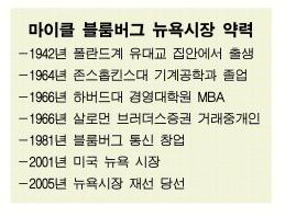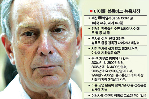 경제전문인 블룸버그 통신사를 소유하고 있는 블룸버그 시장은 재산이 50억 달러(약 5조원)에 이른다. 경제전문지 포천에 따르면 블룸버그 시장은 세계에서 142번째 부자로 기록돼 있다.