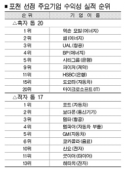 반면 수익성 하위 17개 기업에는 현재 경영난에 허덕이고 있는 대표적인 미국 자동차 회사 포드를 필두로 GM, 코카콜라 등 굴지의 다국적 제조업체들이 10개나 포함돼 제조업의 어려운 현실을 대변해 주고 있다.