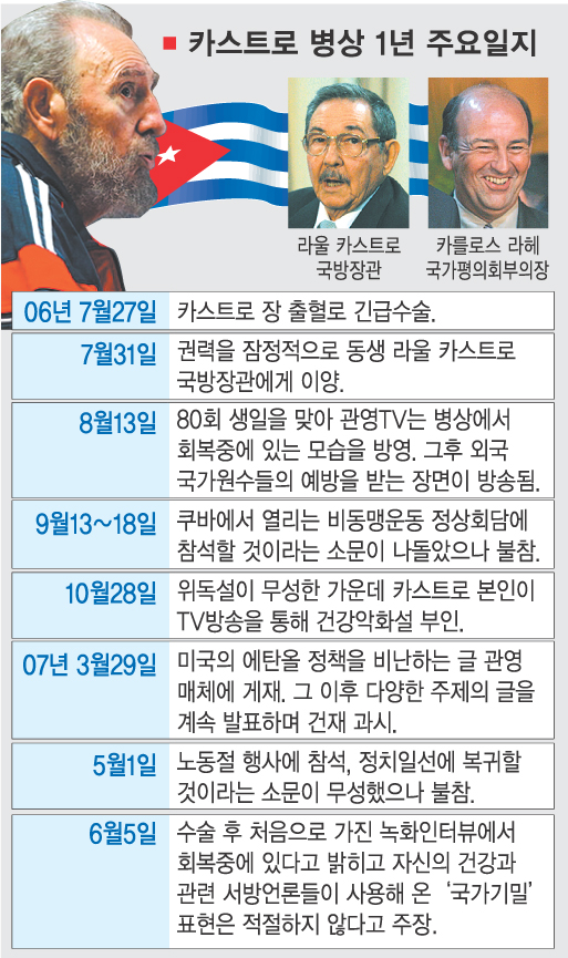 ‘쿠바 국가평의회 의장 피델 카스트로(80)가 조만간 권좌에 복귀할 것인가 아니면 동생 라울 카스트로(75) 국방장관이 그의 형을 대신해 쿠바의 최고 권력자 자리에 오를까.’