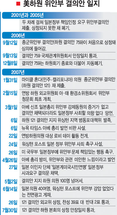 |워싱턴 이도운특파원|미국 하원에서 채택된 ‘위안부 결의안’은 법적 구속력이 없는 문서다. 그러나 정치적 파급력은 매우 클 것으로 보인다.