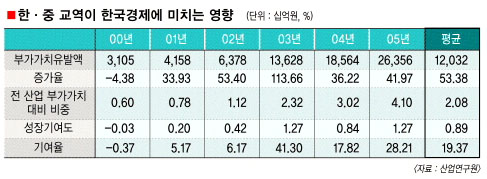 |베이징 이지운특파원|한국-중국간 교역을 통해 2000∼2005년 한국경제에 연간 평균 12조원의 부가가치가 유발된 것으로 조사됐다. 산업연구원의 최근 조사에 따르면 지난 2000∼2005년 한·중 교역과 흑자 규모가 빠르게 증가함에 따라 부가가치 유발효과가 연평균 53%씩 증가, 평균 12조원을 기록했다.