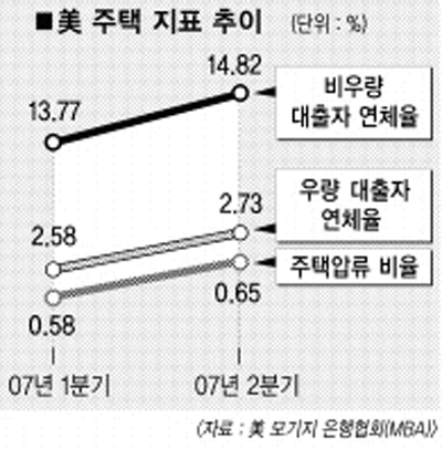 특히 신용도가 낮아 높은 이자를 무는 서브프라임모기지(비우량주택담보대출)로 대출을 받은 사람들의 연체율은 2분기에 14.82%나 됐다.7명 중 1명꼴이다.1분기(13.77%)에 비해 크게 높아졌다.
