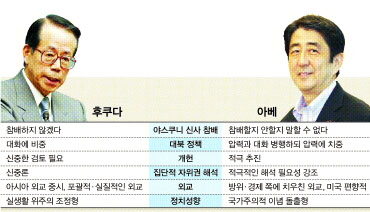 아베 정권이 몰아붙인 ‘아름다운 나라’,‘전후체제의 탈피’와 같은 이념성이 강한 색채는 아예 빼냈다. 이반된 민심을 겨냥한 전략이다.