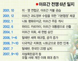 로이터통신은 7일(이하 현지시간) “이날이 미국이 9·11테러의 주모자인 오사마 빈 라덴을 체포하기 위해 아프가니스탄을 침공하며 시작된 테러와의 전쟁이 6년을 맞는 날”이라며 이렇게 보도했다.