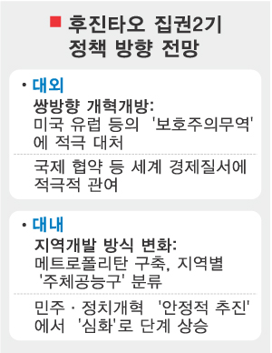 |베이징 이지운특파원|‘이제는 쌍방향 개혁·개방’. 중국은 17대 당대회를 통해 앞으로 국제 경제 질서에서 더욱 적극적인 목소리를 낼 것을 천명했다. 후진타오(胡錦濤) 주석은 개막식에서 “개혁·개방은 현 시대 중국의 운명을 결정하는 유일한 선택이며, 중국 특유의 사회주의 발전과 중화민족의 위대한 부흥 실현을 위해 반드시 걸어야 할 길”이라며 그 중요성을 강조했다. 이는 ‘중화민족의 부흥’과 맞물려, 국제사회에서의 위치도 공고히 하겠다는 의지로 해석되고 있다.