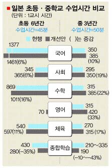 학력을 끌어올리기 위해 중학교의 과학과 영어 수업시간이 현행보다 무려 33%나 크게 늘어난다. 또 초등학교의 산수와 자연시간은 16% 증가한다. 아울러 언어력을 키우기 위해 국어시간의 경우, 초등학교는 6년간 84시간, 중학교는 3년간 35시간 늘린다. 학력저하의 주범으로 몰린 ‘유도리(여유)’ 교육에 대한 보완책으로 수업시간 확대를 선택한 것이다.