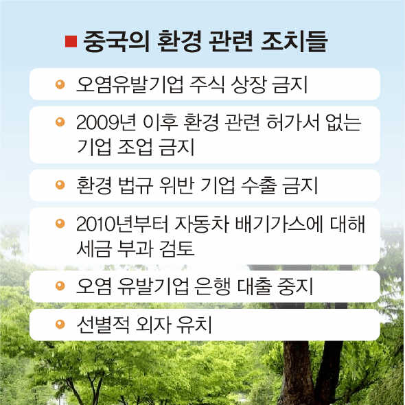 이같은 조치는 ‘환경 대란’에 대한 위기감에서 비롯됐다. 중국은 대기ㆍ수질오염 처리 비용이 연간 1000억달러(약 92조원)로 국내총생산(GDP)의 5.8%를 차지할 정도로 심각하다는 세계은행(WB)의 경고도 나온 상태다.