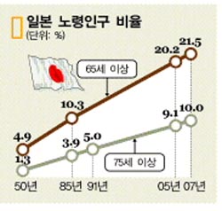 |도쿄 박홍기특파원|일본의 75세 이상 고령자가 지난 1일 현재 처음으로 총인구의 10%나 차지했다.65세 이상 역시 21.5%로 최고치를 기록했다. 즉 5명 중 1명꼴인 65세 이상 노인 중 75세 이상이 절반인 셈이다.