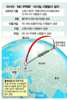 러시아가 미국의 동유럽 미사일방어(MD)체제를 무력화할 수 있는 최신형 미사일 실험에 잇따라 성공했다.‘강한 러시아’를 만들기 위한 행보를 가속화하고 있는 것이다. 러시아는 25일 신형 다탄두 대륙간탄도미사일(ICBM) 시험발사에 성공했다고 이타르타스통신 등 외신들이 일제히 보도했다. 지난 5월에 이어 두번째다.