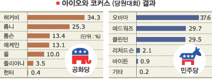 공화당의 허커비 전 주지사는 공화당원 34%의 지지를 얻어 25% 득표에 그친 롬니 전 지사를 눌렀다. 이날 승리한 오마바 의원은 처음 경선에 참여한 젊은 민주당 유권자들로부터 압도적인 지지를 받은 것으로 나타나 오는 8일 실시되는 뉴햄프셔 주 경선에서도 승세를 이어갈 수 있는 유리한 위치를 차지하게 됐다.