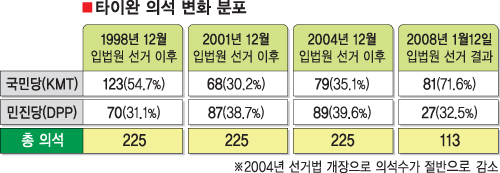 이에 따라 오는 3월22일 치러질 총통선거에서도 마잉주(馬英九) 국민당 후보의 승리 가능성이 더 커지고 있다. 국민당은 효율과 경제성장을 강조하면서 중국과의 불필요한 갈등을 줄이고 관계를 개선하는 노선을 강조해 왔다.