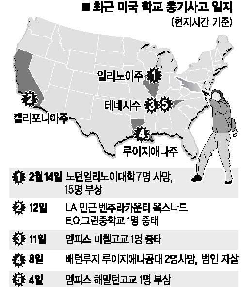 미국 일리노이주 시카고 인근 노던일리노이대(NIU) 교내에서 14일(현지시간) 총기난사 사건이 벌어져 범인을 포함,7명이 사망하고 15명이 부상을 입었다고 CNN 등 현지 언론들이 보도했다. 일부 매체는 ‘밸런타인데이 메시지’라는 제목을 달아 미국사회의 충격을 알리기도 했다. 범행 직후 현장에서 스스로 목숨을 끊은 이 학교 대학원생의 신원은 대학측 요구로 밝혀지지 않았다. 그러나 ‘버펄로 뉴스’는 목격자의 말을 빌어 깡마른 백인이라고 보도했다. 경찰은 19∼32세인 사망자 4명의 신원을 공개했으나 한국인 피해자는 없었다.