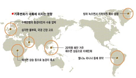 보고서는 이같은 기후변화의 부작용으로 EU 등 지역 공동체 질서가 위기를 맞을 수 있다고 지적했다.