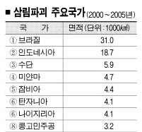 세계은행(WB)이 8일(이하 현지시간) 발표한 ‘글로벌 모니터링 리포트’에 따르면 최근 2000∼2005년 삼림파괴 면적을 조사한 결과 브라질이 3만 1000㎢, 인도네시아가 1만 8700㎢로 나타났다. 이는 각각 서울시 면적의 51배와 30배에 해당하는 규모이다. 이어 수단이 5900㎢로 3위를 기록했다. 보고서는 특히 1990∼2000년과 비교할 때 인도네시아의 삼림파괴 면적에는 큰 변화가 없는 반면 브라질은 2만 7000㎢에서 3만 1000㎢로 늘어나 갈수록 심각해지고 있다고 말했다. 보고서는 이어 브라질과 인도네시아에서 파괴된 삼림이 대부분 농경지로 전환됐다고 덧붙였다. 브라질의 경우, 소 사육 및 콩 경작지 확대와 목재 확보, 인도네시아는 목재 확보 및 기름 생산을 위한 야자수 재배 확대를 삼림파괴의 주원인으로 꼽혔다.