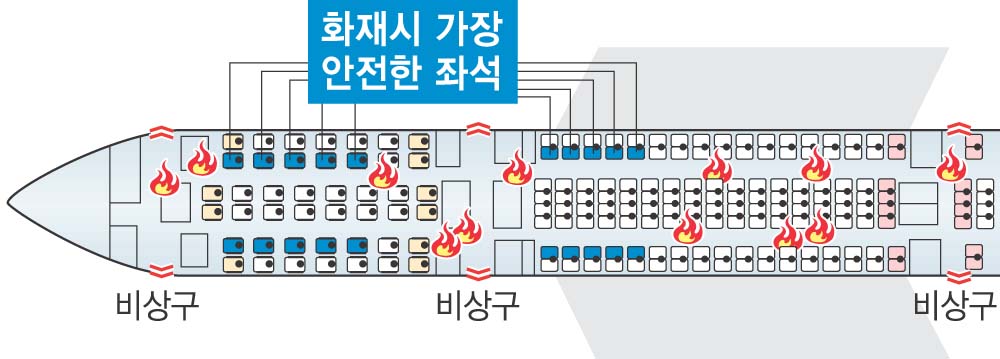 영국 민간항공국(CAA)이 그린위치 대학에 위탁해 105차례의 비행기 사고에서 탈출에 성공한 약 2000명의 증언을 조사한 결과다. 비상구에서 앞뒤로 다섯 번째 열 안에 앉은 승객일수록 탈출할 가능성이 높았다. 복도쪽 좌석 생존율은 64%로 창쪽의 58%에 비해 높았다. 기내 앞쪽 승객들은 화재 발생시 탈출할 확률이 65%인 반면 뒤쪽은 53%에 그쳤다. 출구에서 멀리 떨어져 있을수록 유독성 가스로 숨질 가능성이 컸다.