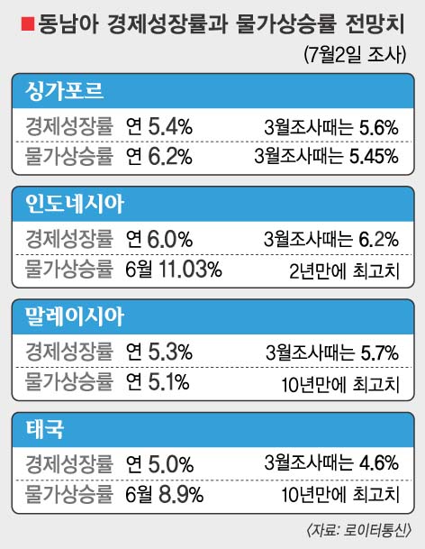 로이터통신은 2일 경제학자 10명을 대상으로 한 설문조사를 인용, 동남아국가들이 올들어 상승곡선을 그리고 있는 물가 때문에 경제성장률이 예상보다 낮아질 전망이라고 보도했다.