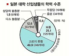 조사결과,499개교 가운데 입학 때 학생들의 학력수준에 대해 ‘충분하다.’는 대학은 6.8%인 34곳에 불과했다.‘보통’은 25.1%인 125곳이다. 나머지는 학력이 불충분한 만큼 대책의 필요성을 강조했다. 요미우리는 “의대나 이과대들처럼 실력이 떨어진 학생들을 졸업시키지 않는 대학들이 점차 증가하는 추세”라고 지적했다.
