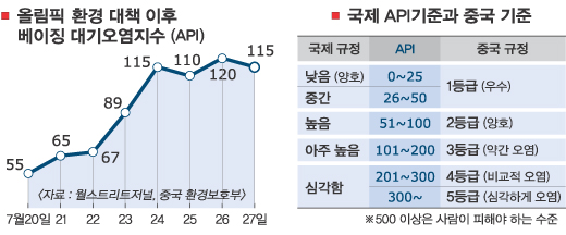 중화 부활의 자부심으로 야심만만하게 준비했던 올림픽이 환경문제로 퇴색되고 있다는 것이다. 워싱턴포스트(WP)와 로이터·AP통신 역시 “청정올림픽은 물 건너 갔다.”는 회의적인 시각을 잇달아 전했다.