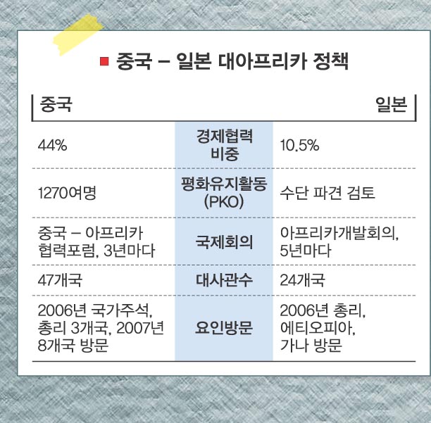 |도쿄 박홍기·베이징 이지운특파원|중국과 일본이 ‘자원의 보고’인 아프리카를 공략하는데 경쟁적으로 나서고 있다. 중국이 저만큼 앞서가는 가운데 일본이 아프리카의 ‘환심’을 사는데 본격적으로 뛰어들었다. 늦었지만 우리 정부와 기업도 ‘자원 전쟁의 시대’에 아프리카의 중요성을 인식하지 않으면 안될 때인 듯하다.