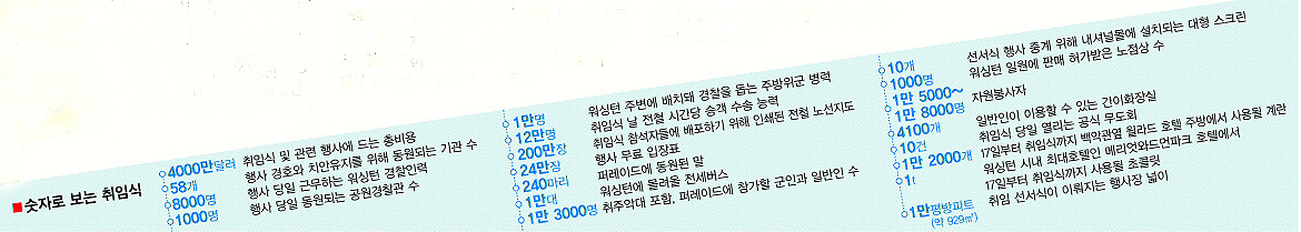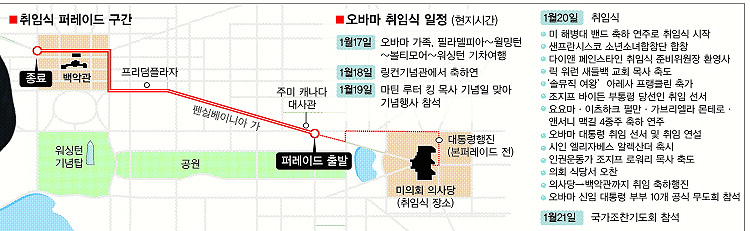│워싱턴 김균미특파원│ 제44대 미국 대통령 버락 오바마의 취임식이 20일(현지시간) 수도 워싱턴 의사당에서 열린다. 미국 최초의 유색 대통령 탄생이라는 역사적인 순간에 참여하기 위해 최대 300만명의 인파가 워싱턴 시내를 가득 메울 것으로 예상된다. ‘미국과의 새로운 약속’이라는 주제로 열리는 취임식은 여러 면에서 제16대 대통령인 에이브러햄 링컨과 관계가 깊다. 148년전 링컨이 취임식에서 사용한 성경에 왼손을 얹고 대통령 취임선서를 하며, 취임식에 참석하기 위한 기차여행도 본떴다. 취임식 후 의회 점심 메뉴도 링컨 취임식 때와 같다고 한다. 무엇보다도 주제가 1863년 11월19일 링컨의 유명한 게티스버그 연설 내용에서 따온 ‘자유의 새로운 탄생’과 일맥상통한다.