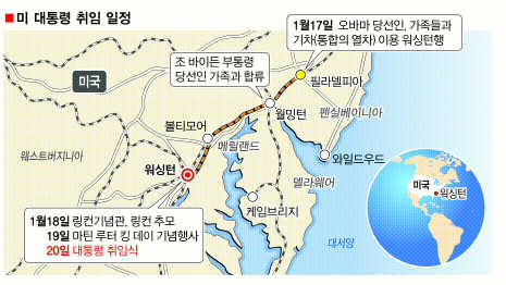 ■ 오바마 워싱턴 입성기│워싱턴 김균미특파원│2년 전 시작된 미국 대통령을 향한 버락 오바마의 긴 여정이 17일(현지시간) 148년 전 에이브러햄 링컨 대통령의 장도를 재현한 기차여행으로 워싱턴에서 종지부를 찍었다.
