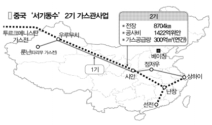 중앙아시아의 투르크메니스탄 가스전과 신장(新疆)위구르자치구의 타리무(塔力木) 가스전 등의 천연가스를 끌어오는 총 연장 8704㎞의 2기 가스관 연결사업에는 지난해 2월 이미 착공한 서부구간(신장위구르자치구~닝샤회족자치구)을 포함, 2011년까지 1422억 위안(약 28조원)이 투입된다. 투르크메니스탄, 우즈베키스탄, 카자흐스탄 등 중앙아시아 3개국을 거치는 국경 밖 가스관 연결공사비까지 포함하면 2500억 위안이 넘는다. 중국 정부는 기계, 전자, 철강, 건설업 등에 미치는 파급 효과가 3000억 위안을 웃돌 것으로 추정하고 있다. 실제 철강재 500만t 등 공사 투입 자재 대부분을 중국산으로 충당키로 했다.