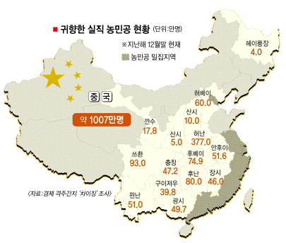 │베이징 박홍환특파원│농민공(농촌 출신 도시 일용노동자)들의 집단행동이 시작된 것일까. 중국에서 수백명의 농민공들이 시위를 벌여 경찰 수백명과 대치하는 사태가 벌어진 사실이 뒤늦게 알려졌다.