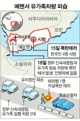 예멘 한국인 관광객 폭탄테러 사건을 수습하기 위해 현지에 파견된 정부 신속대응팀과 유가족이 탄 차량 2대가 18일 오전 8시40분(한국시간 오후 2시40분) 공항으로 이동하던 중 자살폭탄 테러로 보이는 공격을 받았다. 다행히 인명 피해는 없었지만 잇따른 폭탄테러가 발생하면서 알 카에다가 한국인을 겨냥한 것이 확실한 게 아니냐는 관측이 굳어지고 있다.