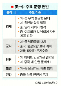 경제분야도 불이 붙었다. 같은 날 티머시 가이트너 재무장관은 저우샤오촨(周小川) 중국 인민은행장이 “국제통화기금(IMF)의 특별인출권(SDR)이 슈퍼통화가 될 가능성이 있으며 지금이 제 기능을 발휘할 때”라고 ‘달러 제치기’ 발언을 한 것과 관련, “절대 용납할 수 없다.”고 비판하고 나섰다. 특히 최근 미 하원이 티베트 인권 결의안을 통과시키고 남중국해에 이지스함까지 보내기로 결정, 미국의 강경대응 의도에 관심이 쏠린다.