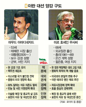 반서방 기치를 내걸고 있는 강경·보수파 마무드 아마디네자드 현 대통령과 친서방 후보인 개혁파의 미르 호세인 무사비의 양강 구도는 대외적으로도 첨예한 문제다. 최근 미국과 이란의 관계 변화 속에 친서방 진영에 대한 이란 국민의 지지가 커진 까닭이다. 버락 오바마 미 대통령은 최근 상극의 관계를 걸어 왔던 이란에 화해의 손길을 내밀었다. 이제 남은 것은 이란 국민이 오바마의 실험에 어떻게 화답할지다.