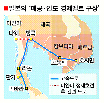 │도쿄 박홍기특파원│일본 정부의 ‘메콩·인도 경제벨트 구상’이 본격화되고 있다. 구상의 핵심은 우선 베트남의 호찌민시로부터 캄보디아의 수도 프놈펜, 태국의 수도 방콕을 거쳐 라논·판가·팍바라 등 3개국을 잇는 고속도로의 건설이다. 또 정세가 불안한 미얀마가 안정을 되찾을 경우, 방콕과 미얀마의 다웨를 연결하는 고속도로도 닦을 예정이다. 방콕·프놈펜·호찌민 등 3곳을 관통하는 이른바 ‘동서고속도로’의 총연장만 1000㎞에 달하는 대역사다.