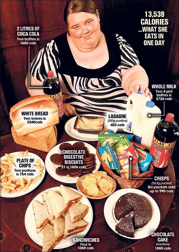 하루에 식빵 두 뭉치,칩 두 접시,초콜릿 다이제스티브 비스킷 21개,샌드위치 4조각,크리습스 6봉지,미디엄 사이즈의 초콜릿 케이크 등을 먹어치웠고 2리터 들이 코카콜라 두 병과 탈지 우유 두 병을 거뜬히 마셔댔다.