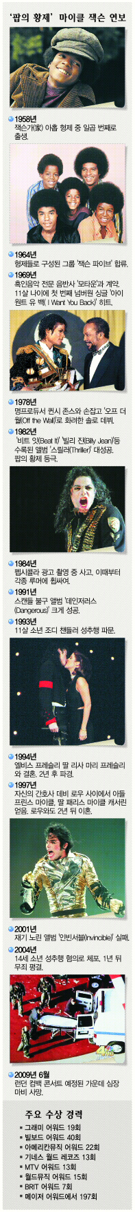 영국 런던에서의 컴백 콘서트를 불과 2주일가량 앞두고 세상을 떠난 마이클 잭슨은 ‘팝의 황제’라는 수식어가 조금도 어색하지 않았던 뮤지션이다. 13개의 넘버원 싱글, 7억 5000만장에 달하는 전체 앨범 판매고, 세계에서 가장 많이 팔린 앨범 보유, 그래미상 13차례 수상 등 그를 따라다니는 기록들은 헤아릴 수가 없다.