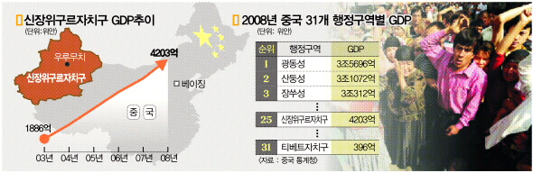 문제는 최근 10년간 중국 정부가 ‘서부대개발’을 발표하면서 이 지역에 자본주의가 유입되면서부터다. 신장위구르자치구의 GDP는 최근 5년새 1886억위안(약 35조원)에서 4203억위안으로 2배 이상 증가했다. 자원의 보고인 위구르 지역 개발은 중국의 국익과 관련된 중차대한 문제였던 까닭이다. 중국 정부는 이 지역에 한족 주민들을 대거 유입시켰고 사업 규모를 늘려갔다. 하지만 개발 과정에서 나온 부(富)는 모두 한족의 차지였고 위구르족은 소외됐다. 실제 신장위구르자치구의 경제 중심지이자 수도인 우루무치는 한족의 이주가 늘어나면서 한족 인구가 70% 이상에 달하고 위구르족은 10%에 불과하다.