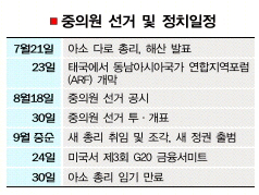 아소 다로 총리는 21일 오후 중의원 본회의에서 중의원해산을 단행한다. 해산 뒤 정부는 임시 각의에서 다음달 18일 공시와 30일 투·개표의 선거일정을 확정할 방침이다. 중의원의 총 의석 480석은 선거구제로 300명, 비례대표로 180명을 선출한다. 총선거는 지난 2005년 9월 이후 4년 남짓만이다. 자민당은 당시 고이즈미 준이치로 전 총리의 ‘우정개혁’에 따른 돌풍에 힘입어 296석을 얻었다. 자민당의 현 의석은 입당 등을 통해 303석에 이른다. 민주당의 의석은 112석이다.