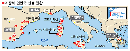 ●스페인 등 잠정보험료 수억유로 추산지난주 시작된 지중해 연안국 산불의 기세가 꺾이지 않고 있다. 27일 영국 BBC 방송 등에 따르면 이번 산불로 8명의 사망자가 발생했으며 이탈리아, 스페인, 프랑스, 그리스 등지의 산림지역 수만㏊가 잿더미로 변했다. 잠정 보험료만 수억 유로가 넘을 것으로 추산된다.