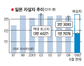 1978년부터 자살 통계를 내온 일본은 1997년까지 2만명대를 유지했지만 1998년부터 지난해까지 11년째 3만명을 넘었다. 또 자살을 줄이기 위한 방편으로 지난해부터 월별 통계를 잡고 있다.