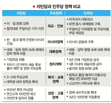 외교·안보 분야의 입장차도 분명하다. 미·일 동맹을 외교의 기본축으로 삼은 점은 같지만 거리감이 다르다. 자민당은 미국 중시, 심하게 말해 ‘추종’의 입장인 반면 민주당은 ‘대등한’ 미·일 관계, 유엔 중시를 내세우고 있다. 민주당은 주일 미군 지위협정의 재검토, 해양자위대의 인도양 급유지원 중단 등 민감한 문제까지 공약으로 내세운 상태다. 때문에 미국 쪽에서는 민주당 정권이 들어설 경우에 대비, 전략을 짜고 있는 것으로 알려졌다.