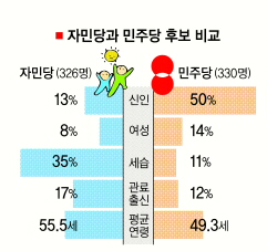 민주당의 새내기 후보는 소선구제에 114명, 비례대표제에 50명 등 164명으로 무려 50%에 육박했다. 신인들의 평균 나이는 46세다. 지방의원이 39명, 전직 관료 16명, 기업인 13명 등의 순으로 많았다. 젊고 새로운 피를 수혈한 셈이다. 자민당의 새내기는 13%인 43명에 불과했다. 민주당의 정치신인 공천은 마치 2005년 선거 때 당시 고이즈미 준이치로 총리가 직접 발탁, 당선으로 연결시킨 이른바 ‘고이즈미 칠드런’의 전략에 비유될 정도다. 전체 후보의 평균나이에서도 자민당은 55.5세인 반면 민주당은 49.3세로 결과적으로 50세 이하로 낮췄다.