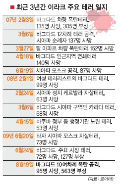 이라크에서 대형 폭탄테러가 잇따라 발생하고 있다. AFP통신 등 외신에 따르면 19일(현지시간) 수도 바그다드 중심지에 폭탄 및 박격포 공격이 10여차례 잇따라 발생, 최소 95명이 숨지고 536명이 다쳤다. 특히 이번 테러는 지난 6월 미군이 주요 도시에서 철수한 이래 최악의 인명피해를 기록, 미군 철수로 인한 이라크의 ‘안보 공백’ 문제가 도마에 올랐다.●‘미군 철수’와 ‘테러’ 상관관계 얼마나?