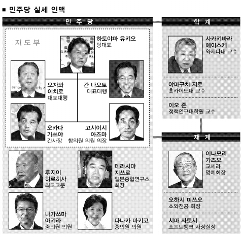선거 뒤 새 정정권에서는 ‘당의 얼굴’ 하토야마 대표와 이번 선거 승리의 주역으로 불리고 있는 ‘막후 실세’ 오자와 이치로 대표대행의 투톱 체제가 파워 인맥의 뿌리가 될 것으로 보인다. 투톱 체제 밑으로, 간 나오토 대표대행과 오카다 가쓰야 간사장, 고시이시 이즈마 참의원 의원 의장까지 민주당의 핵심 지도부를 구성하고 있다. 이들이 차기 내각에서 주요 직책을 차지하리란 전망이다.