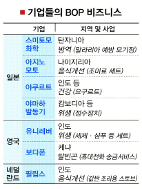 개도국의 빈곤해소와 위생개선을 수익 창출로 연결하는 이른바 ‘BOP(Bottom of the pyramid)비즈니스’다. 세계 최저소득층을 겨냥, 사회공헌과 수익을 동시에 챙길 수 있는 ‘일석이조’의 사업이다. 시장 규모는 5조달러(약 6000조원)로 추산되고 있다.