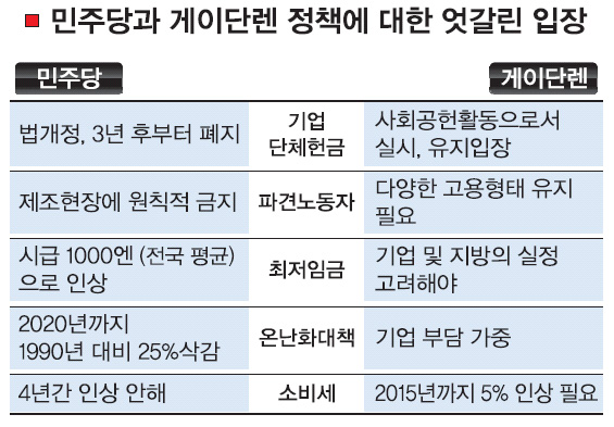 오는 2020년까지 이산화탄소(CO2)를 1990년 대비 25% 삭감하는 정책이 게이단렌의 이해와 협력이 없이는 사실상 불가능한 까닭에서다. 제조업에 노동자 파견을 원칙 금지하는 노동자파견법의 개정도 마찬가지다. 최저임금의 인상도 경영자 측인 게이단렌의 협조가 필요하다.